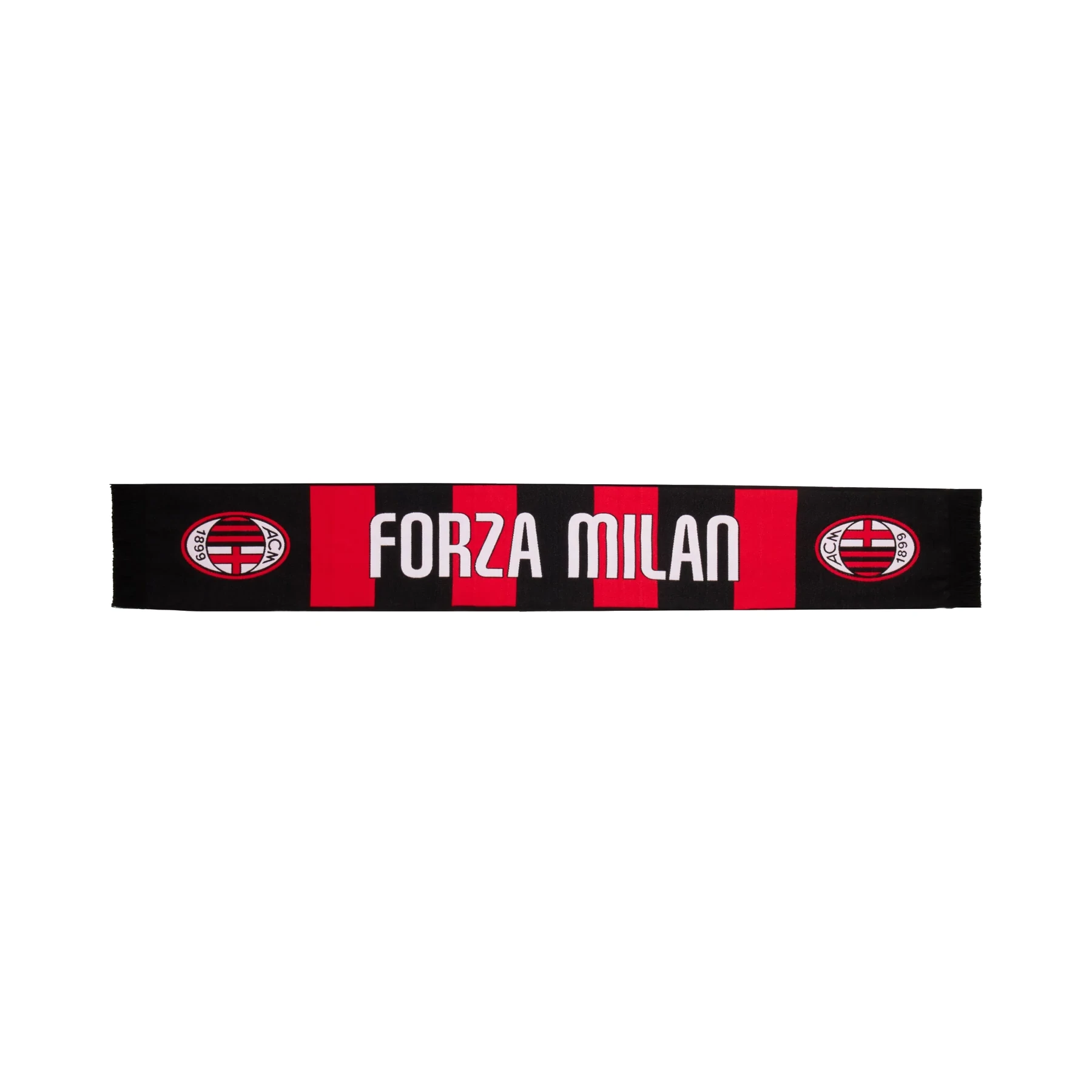 AC Mailand „Forza Milan“ Fußballschal. Der Schal ist in den Vereinsfarben von AC Mailand gehalten und vollständig in Schwarz und Rot. An den Seiten befindet sich das Vereinslogo von AC Mailand, und in der Mitte ist der Schal rot-schwarz gestreift mit dem Schriftzug „FORZA MILAN“. An den Enden befinden sich schwarze Fransen. Ein idealer Fanschal für die kältere Jahreszeit und perfekt für den echten AC-Mailand-Anhänger. Der Fußballschal besteht aus 70 % Acryl und 30 % Polyester.