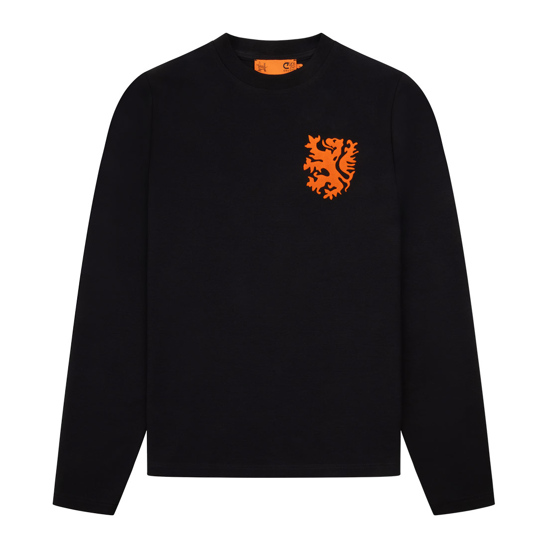 Le maillot est doté de manches longues et d’un col rond classique, offrant un style intemporel et un grand confort. Sur la poitrine gauche, le lion néerlandais apparaît en orange, symbole fort et reconnaissable de la sélection nationale.