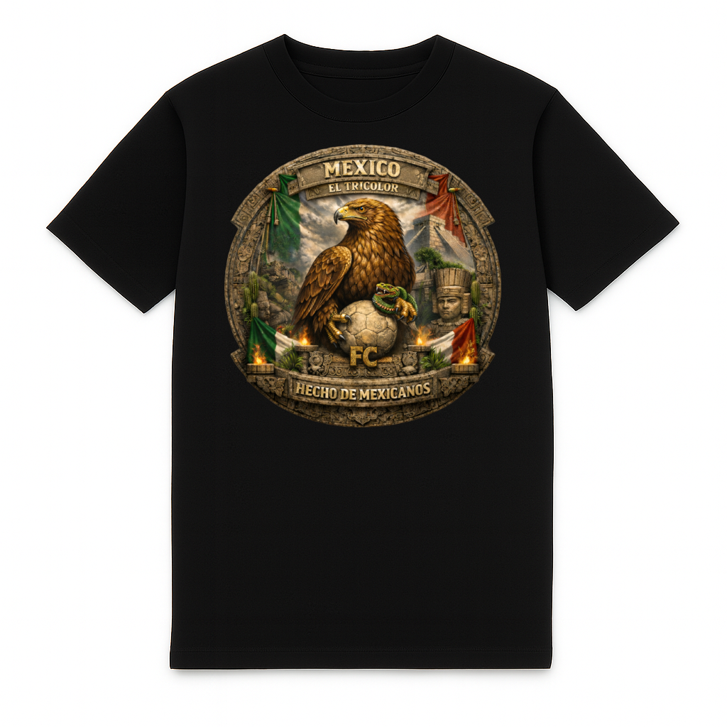 Superbe T-shirt de football Mexico de FC ELEVEN pour adultes. Ce T-shirt heavy est confectionné en coton biologique épais. Il se distingue par sa grande impression graphique du Mexique au dos. L’imprimé présente les textes Mexico, El Tricolor et Hecho de Mexicanos, avec au centre un aigle tenant un serpent et un ballon de football. Sur la poitrine gauche figurent les initiales FC en noir, sous forme de logo en silicone. Le T-shirt est entièrement noir, doté d’un col rond et d’une coupe normale.