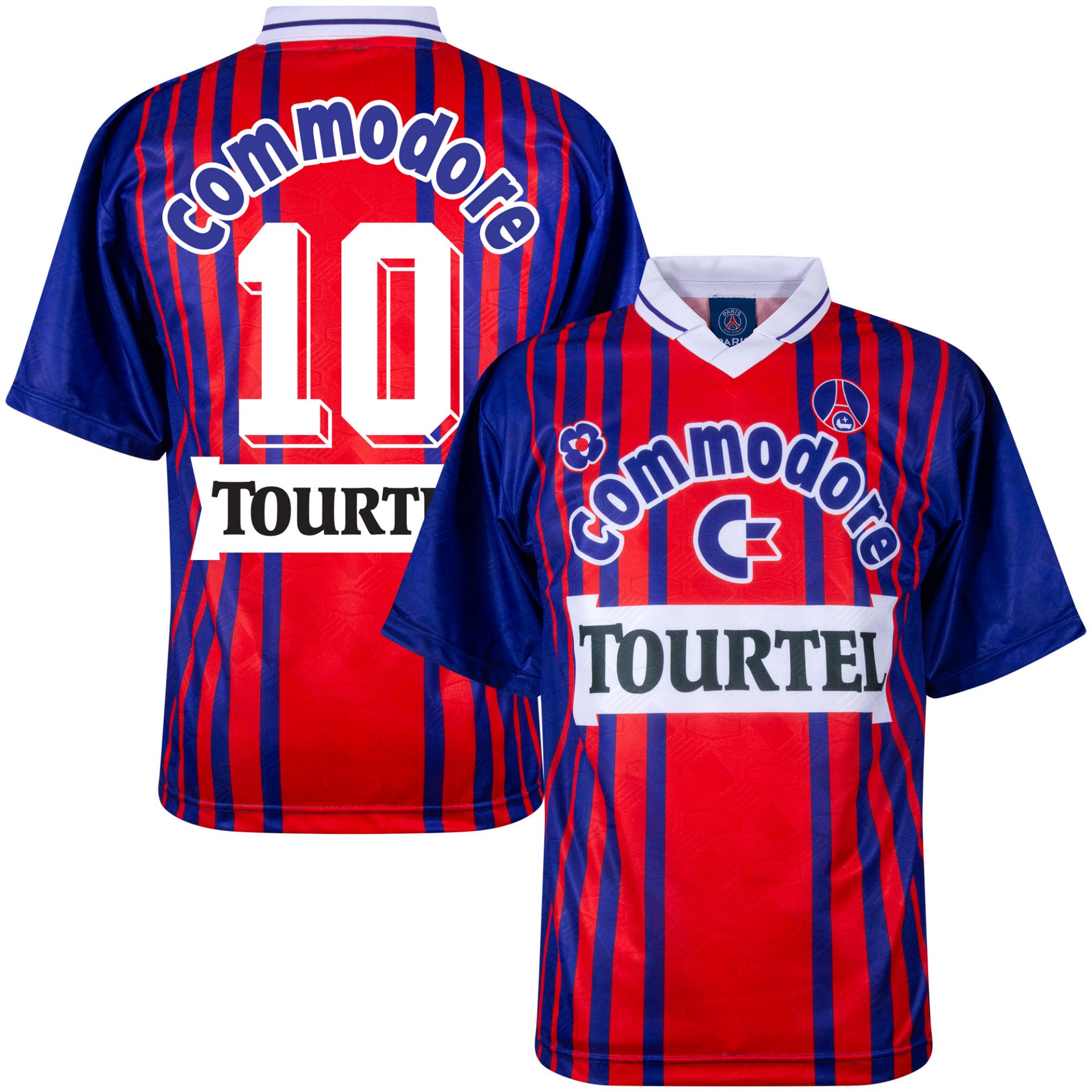 Le maillot domicile rétro PSG 1993-1994 présente les couleurs traditionnelles rouge et bleu avec les bandes verticales caractéristiques. Les logos historiques des sponsors Commodore et Tourtel apparaissent sur la poitrine, comme sur le modèle original. L’écusson officiel du Paris Saint-Germain est placé sur la poitrine gauche.