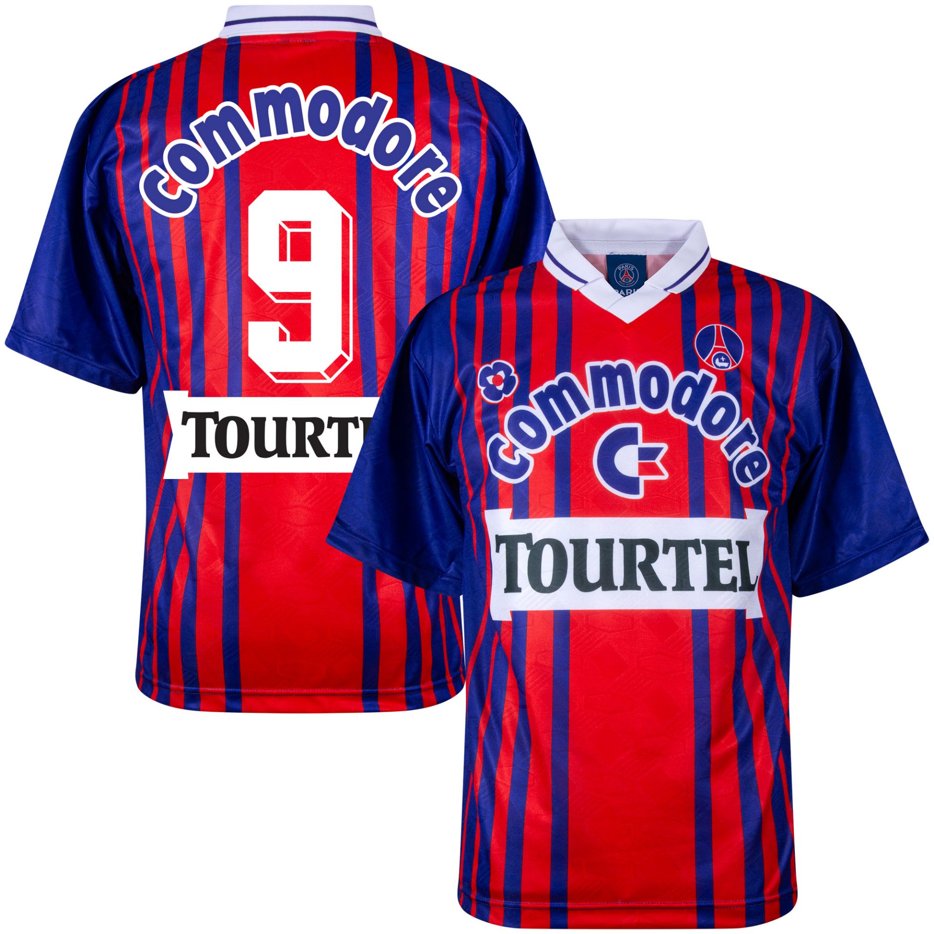Le maillot domicile rétro PSG 1993-1994 présente les couleurs traditionnelles rouge et bleu avec les bandes verticales caractéristiques. Les logos historiques des sponsors Commodore et Tourtel apparaissent sur la poitrine. L’écusson officiel du club est placé sur la poitrine gauche.